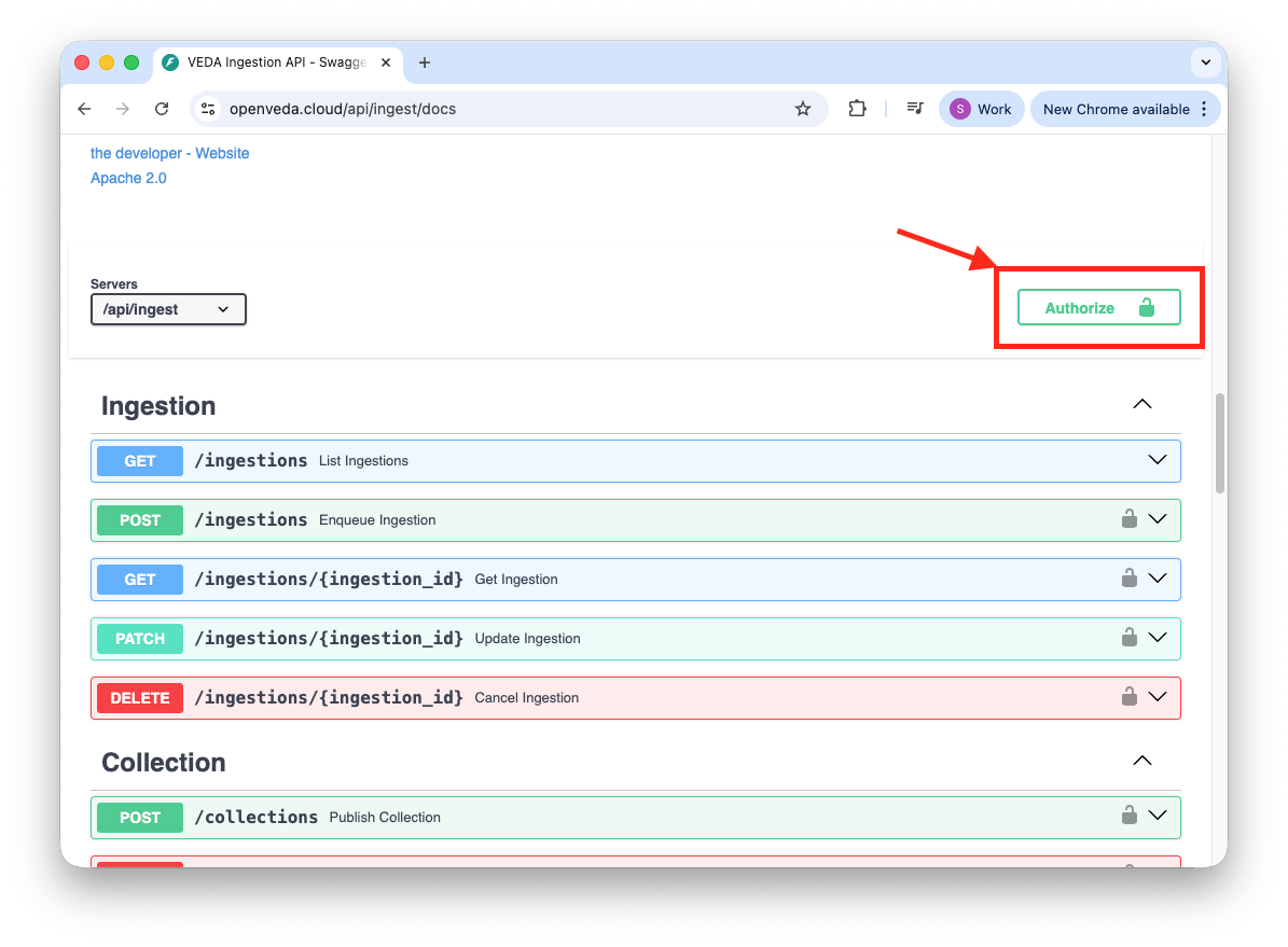 - Go to openveda.cloud/api/ingest/docs