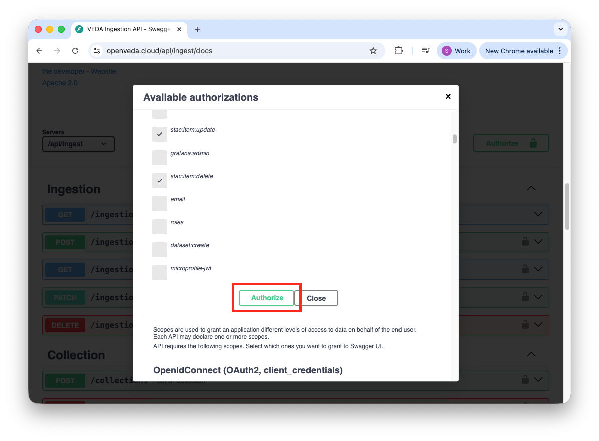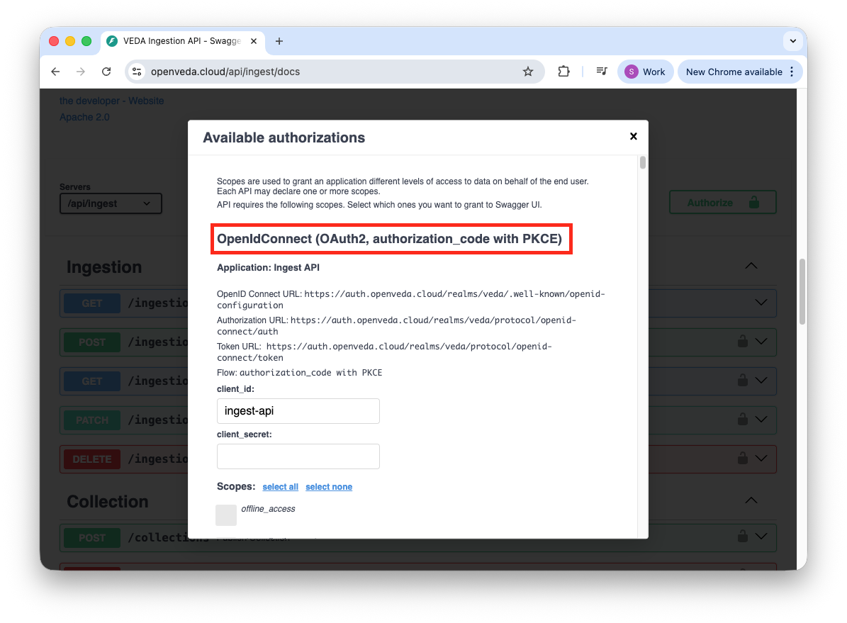 - Navigate back to the Ingest API docs page and select the Authorize button within the PKCE section.